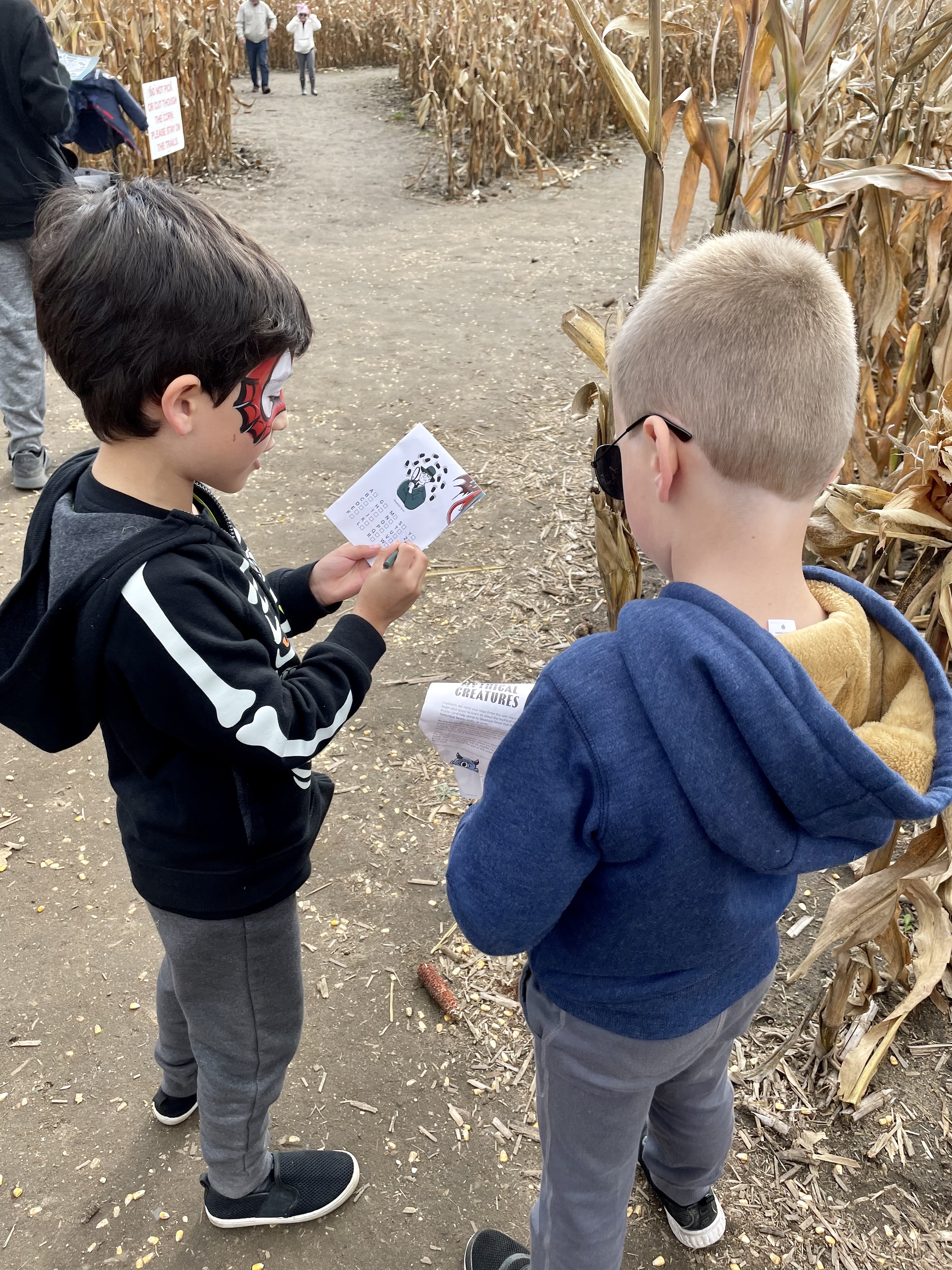 Besties for life! Logan and Connor marking the letters they have found in the corn maze