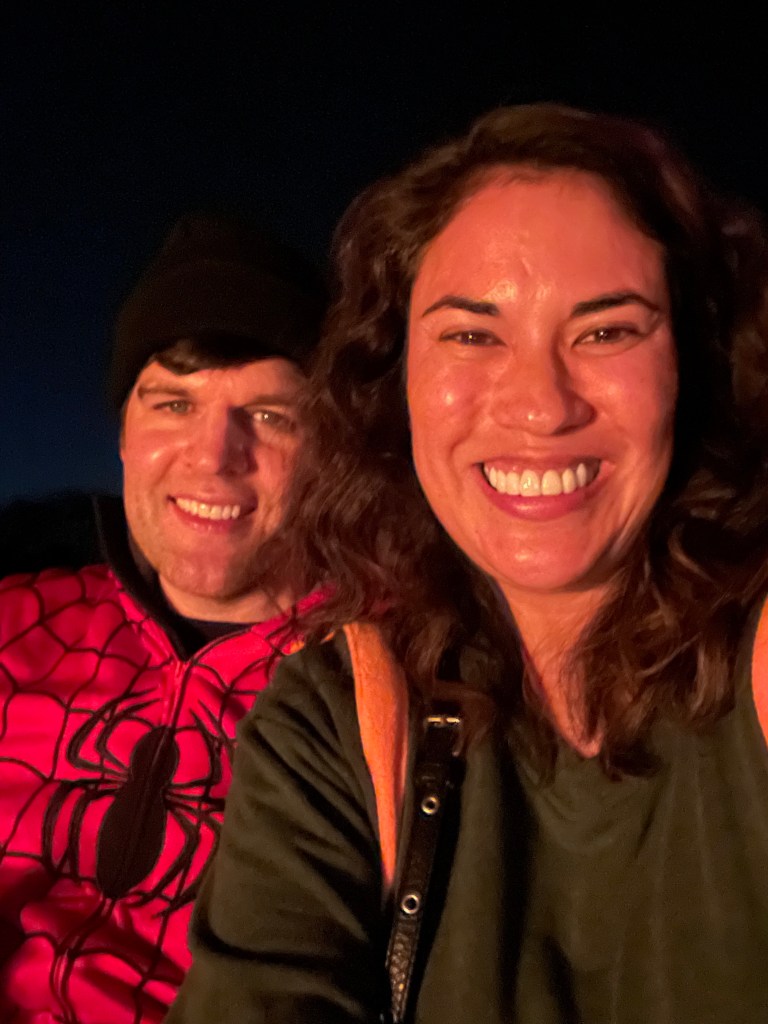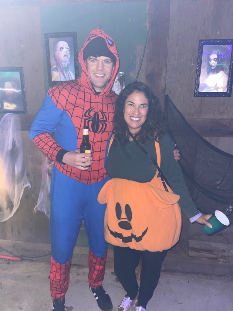 It was going to be in the 50s and temps dropping so I opted for warmth over cute lolol I love my Mickey Mouse pumpkin costume since it is very warm and super easy to take on and off. Dan wore his Spiderman onsie and was also very warm and cozy.