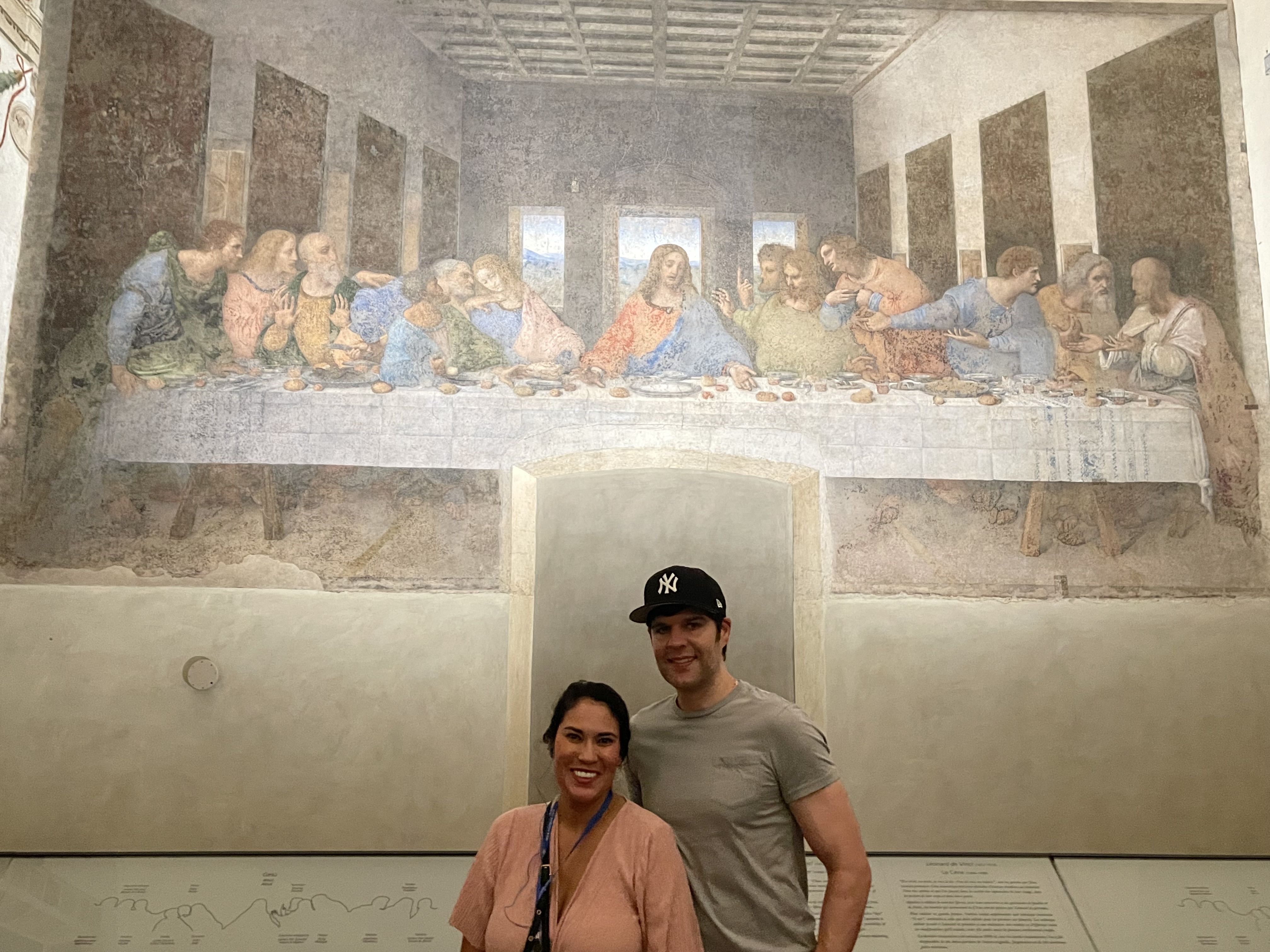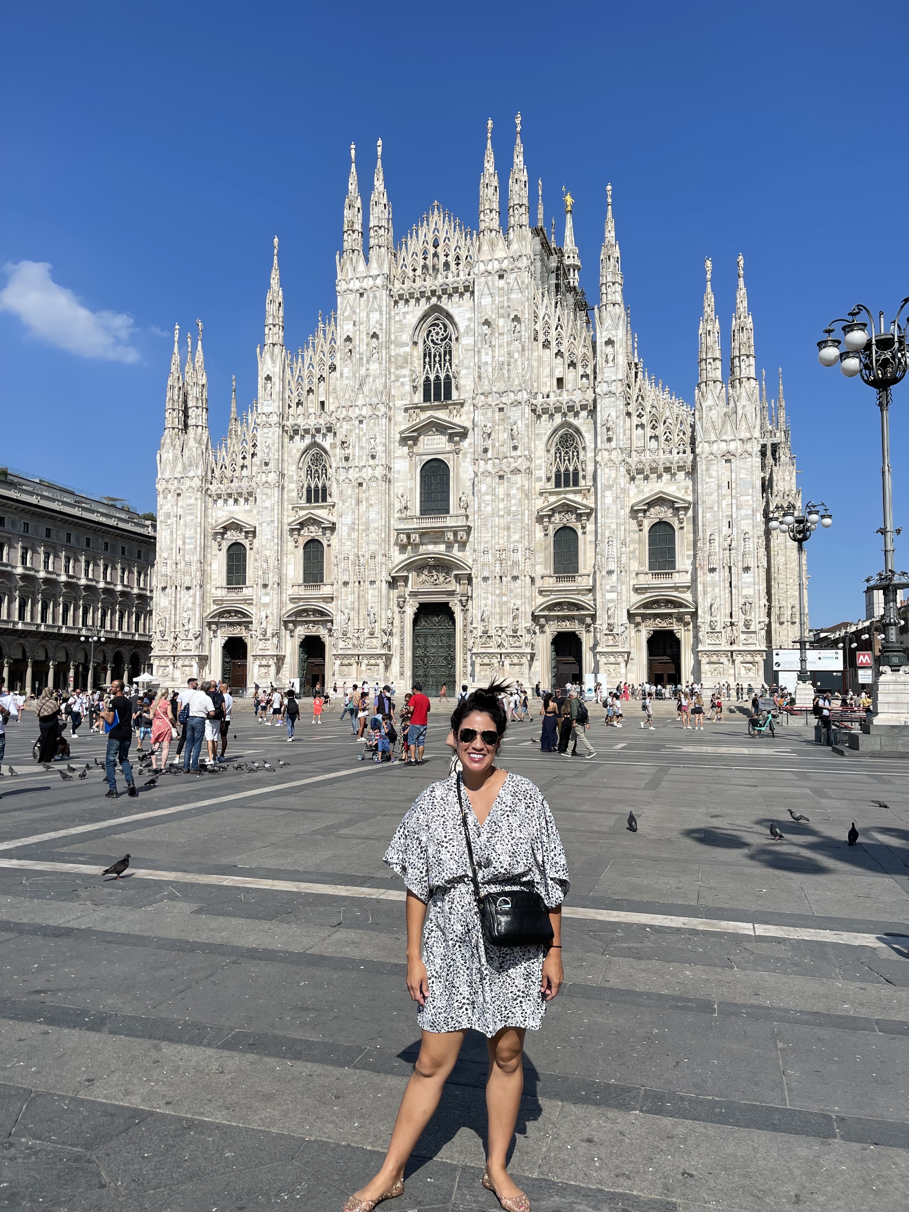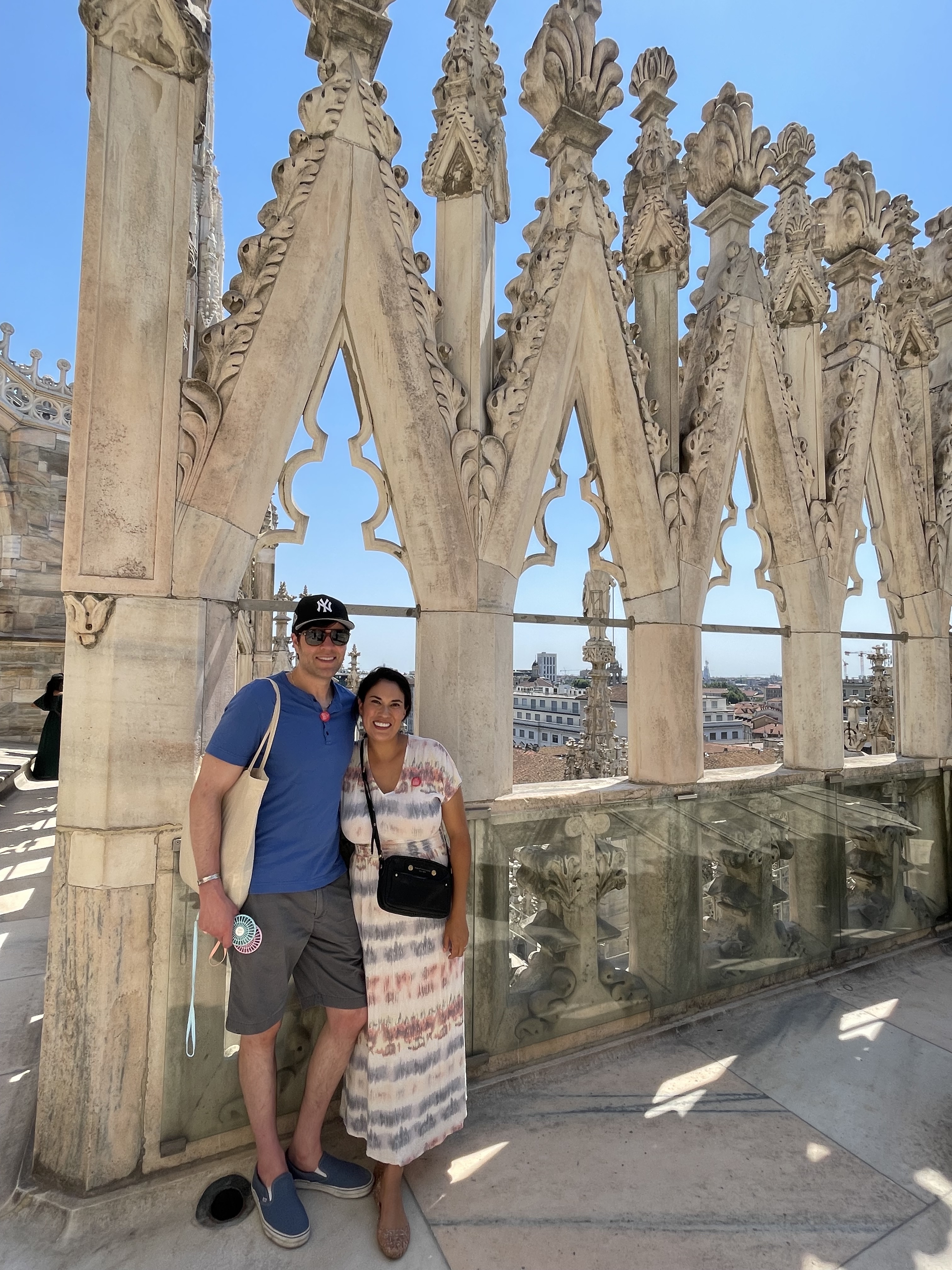 Excited and on the planeI am one of the few of my friends that loves airplane and hospital food, but this United dinner was gross. This is coming from someone who will eat anything that is not spicy I was grossed out by it. I still ate it but did not like it.Getting close to Milan and our snack, yogurt was fine, biscotti was blahOnce we got to hotel, we changed and ran out to see the DuomoThe shopping district, I am well aware I take terrible photos lolol. I really just like taking pictures of the architecture and the stone work on buildings. Here I loved the arches and the glass ceilingThe murals were neat tooI love seeing things like this on the floor and it reminded me of Sullivan’s work in Chicago so I had to take a picture of it. I love how you can find art looking up or down.Our first meal in Milan! This spaghetti with clams is my very favorite and anytime I see it on a menu I order it. This cheesecake was so light and fluffy I ordered another one after finishing this oneWe got tickets to see Da Vinci’s Last Supper. Apparently it was an experiment that he did with tempura paint on dry plaster and I love art so I had to see it with my own eyes.It did not disappoint and it was beautiful!This was across from it We then walked over to the castle-Castello SforzescoIt was hot this day but I enjoyed walking around and of course had my handy fanI think Dan hated me at this point because I wanted to see the Egyptian Museum they had there, but it was super late and hot. He caved after this snack but my phone died and I didn’t want to push anymore buttons asking to use his phone to take pictures so I can only say you must go to the museum if you are in Milan. They have pages from the actual Book of the Dead ahhhhhhWe had a food tour scheduled this night and this was the first stop. This bar was really cool because every 6 months they change countries and we happened to be there when it was the US’s turn. They played oldies music and had lots of American decorations around the bar. I love food tours because I get to go to places I otherwise would never imagine going My cherry bomb drink was so good and Dan really liked his Lemon drinkOur next stop was a wine bar and omg it was so good! We had a cheese board here and it was one of my favorite stopsNext was this potato place that had the most interesting toppings. I love baked potatoes so I was so excited to be here, mine had burrata and some tomato topping that was sooo good. Dan got a Greek potato and he really liked his tooOMG, I so wish this was not the last stop because this sandwich was the most amazing thing I have ever eaten! We got an eggplant parmesan sandwich and it was literally the best sandwich I have ever had in my life, pictures of course do no justice and just seeing this picture my mouth drools from the delicious memory. Last stop was of course gelato Our last stop was by this canal and it was so pretty and serene I loved how they had so many bars along the canalThey even had love locks so of course we got one doneIt was so hot out but we were so happy lololPS every time I see the lock I giggle at how Dan wrote his own name looking like Don lolololol After our food tour we were stuffed but I had to have a drink along the river. Thank God Dan goes along with so many of my shenanigans and we enjoyed a very tasty drink and really liked the ambiance of the night life Milan had to offer.The Duomo of course so beautiful We had a day trip in the morning and since the Duomo was literally next door to us it was easy to get great pictures I love coffee art Our day trip was to Lake Como and Bellagio Love how unique these buildings were in Lake ComoA light lunch in Lake ComoHiOn the boat to Bellagio Little stairways all over Bellagio Duh, we had to drink again lololAnd of course eatWe were lucky to get a nice shady spot. Another hot day but I packed our fans so we were fineLoveHow pretty! On the boat Later at night back in Milan and of course eating againThe arch to the Fashion Shopping area right next to the DuomoWe ended up at a rooftop that night with a great view of the Duomo and fun dancing music. Trust me I felt so old but happy that I was able to experience thisThe next day was our tour for the Duomo, it started inside the beautiful church I am a huge Lord of the Rings fan and walking in immediately reminded me of the mines in The Hobbit when the dwarves and Bilbo go to the Lonely Mountain. Just so beautiful and breathtaking! Oh hi beautiful big stained glass windows They say 1 of Jesus’s 3 nails from the cross is up there were that dot is on the cross Just amazing views from the rooftop People were so nice and always offering to take our pictures They are doing an amazing restoration to the Duomo and I look forward to visiting it again and be in awe of all of its glory Love the stone work The little details are incredible This section hasn’t been cleaned/restored yet but still you can see the beauty I was awestruck when I saw this PeekabooAgain with the amazing details I feel like every church has these marble steps and I always feel like one step and I am going to tumble down so of course I had to take a picture and tempt fate This salad was just so fresh and good I love bubble tea and I base them all on how good they cook the tapioca balls. These were hard and not chewy at all. The pineapple drink itself was ok but I was sad the boba was not good and it was a paper straw which I get to be more eco friendly but it got so soggy so fast and almost impossible to suck up the bobaThe start of another day trip to the Swiss Alps and a very scenic train ride through the Alps STOP!!! This was taken by me on the bus and why is the Swiss Alps so beautiful? I am by far the least nature girl you will ever meet and I was already talking to Dan about visiting here in the winter some year because it was just so beautiful and I want the kids to experience skiing here.A famous chocolate shop in St Moritz . It was really ritzy here and e